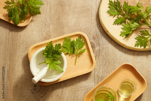 Top view of mugwort decorated with mortar and pestile wooden dish in wooden background for exfoliate advertising