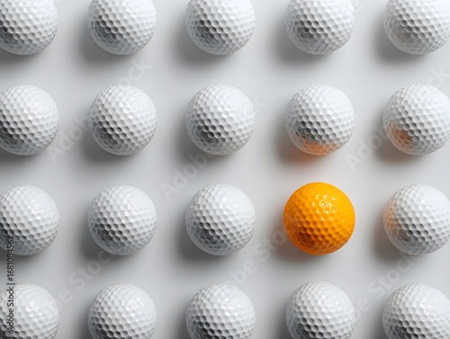 top view of multiple white golf balls arranged in neat rows across a bright white background with one orange golf ball placed among them symbolizing individuality creativity and sporting precision
