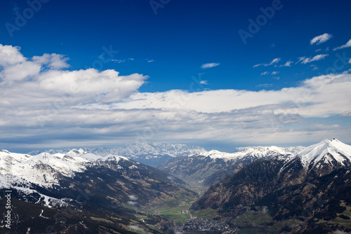 Top view of narrow valley with villages in Austrian Alps. Bright sky