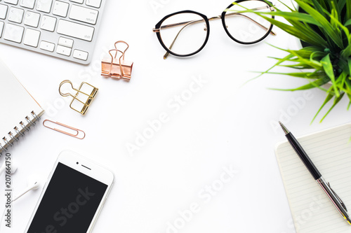 Top view of office desk table with modern accessories.flat lay background design