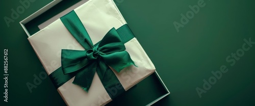 Top view of open gift box or present box with green ribbon and bow on a green background, fresh and lively