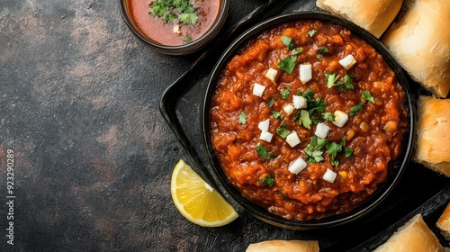 Top view of pav bhaji with buttered buns and lemon wedges, copy space in the bottom half.
