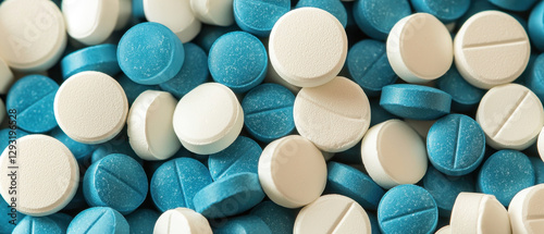 Top view of pile of mixed blue and white round pills, medical background
