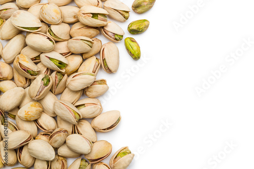 Top view of pistachio nuts scattered on white background with copy space.