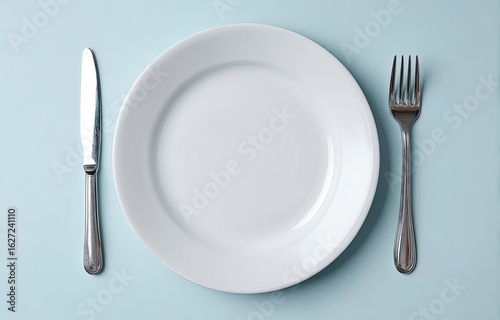 Top view of plate setting ready to eat, isolated on plain background. Stock photo