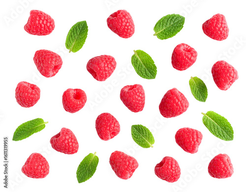 Top View of Raspberries with Mint-Like Leaves, isolated on white background PNG