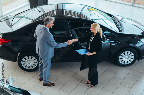 top view of sales agent shaking hand with customer in car dealership showroom