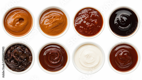 Top View of Six Assorted Sauces in White Bowls, Arranged in a Neat Row, Showcasing a Variety of Colors and Textures, Isolated on White Background for a Clean and Minimalist Culinary Presentation