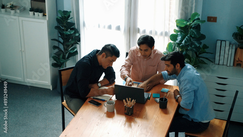 Top view of smart business team looking at laptop while analyzing marketing data and financial graph or stock market chart and make a decision for investment at meeting with sticky notes. Convocation.