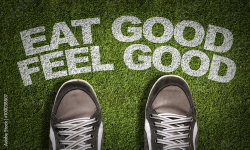 Top View of Sneakers on the grass with the text: Eat Good Feel Good