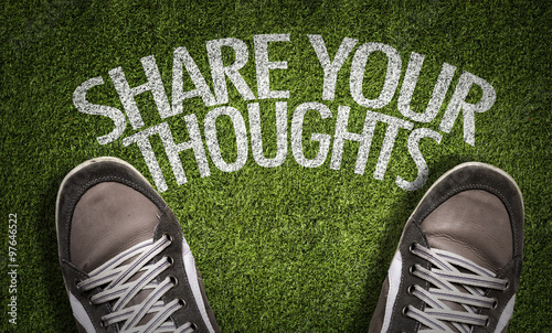 Top View of Sneakers on the grass with the text: Share Your Thoughts