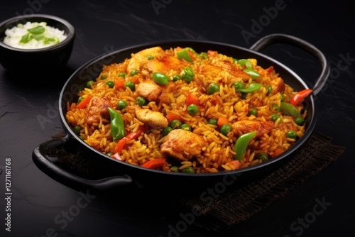 Top view of Szechuan Rice in a black bowl with bell peppers green beans carrots and chicken breasts on a dark slate background