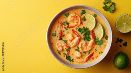 Top view of Thai coconut shrimp soup with lime and herbs, ample space for text