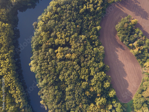 Top view of the river with turns of meanders and green forests in bright sunlight. Creek in the park among the trees. Aerial drone view. Summer or autumn time.