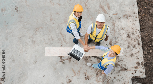 Top view of three construction engineers and workers meeting, planning for successfully building houses. Overhead view at group of Asian labor people working together at residential construction site