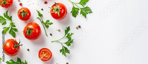 Top view of tomatoes garnished with parsley leaves on a white background, providing copy space in the image.