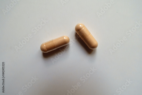 Top view of two pink capsules of palmitoylethanolamide dietary supplement