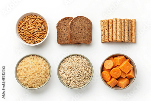 Top view of various carbohydrate-rich foods in bowls and on a white background.