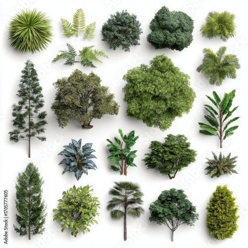 Top view of various plants and trees, isolated on a white background. 3D rendering