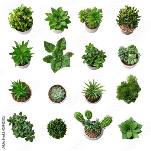 Top view of various potted succulent plants arranged neatly, showcasing diverse leaf shapes and vibrant green hues. isolated on PNG transparent background