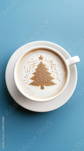 Top view of white cup with christmas tree latte art in cappuccino foam. Barista concept. Generative AI