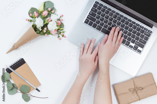 Top view of white desk with laptop, mobile phone, woman hands. Flat lay of workspace