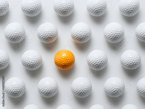 top view of white golf balls perfectly aligned in rows with a single orange ball standing out on a clean white background symbolizing individuality precision and focus in modern sporting lifestyle