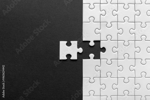 Top view of white puzzle with one piece misaligned, on black background, black and white contrast