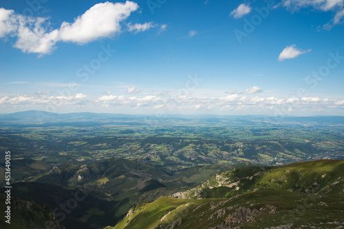 Top view on Zakopane from Tatra mountains trail with vivid cloudy sky
