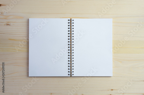 Top view open blank notebook on a light wooden table