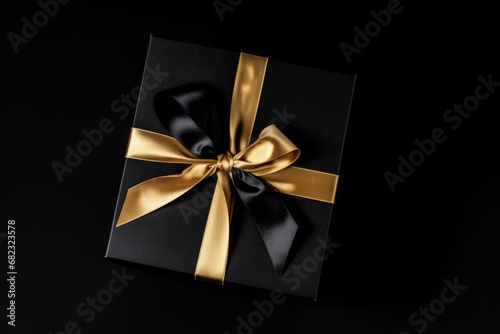 Top view photo of black giftbox with golden satin ribbon bow on isolated black background. Generative AI