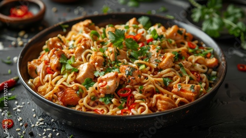 Top view photo of chicken noodles served in a bowl. Indonesian special food. selective focus