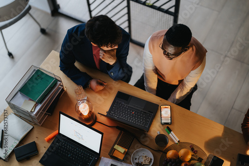 Top view photo of late-night teamwork and collaboration drive business success through analyzing statistics and sharing ideas for on-time project completion.