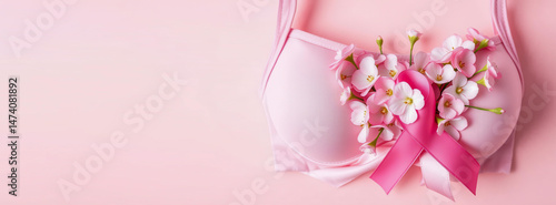 Top view: pink ribbon attached to bra filled with eustoma flowers. Symbol of women's health and fight against breast cancer. Aesthetic image for social advertising.