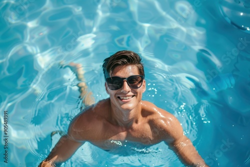 top view Portrait of a smiling young man in black sunglasses swimming in swimming pool