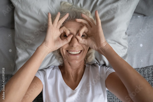 Top view portrait of happy senior woman relax in comfortable bed at home have fun make funny faces, overjoyed mature 60s grandmother feel excited optimistic rest in bedroom, good maturity concept