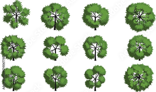 Top view trees, isolated tree canopies, landscaping design, garden planning assets, foliage textures, vector plants, outdoor environment, urban greenery, nature icons