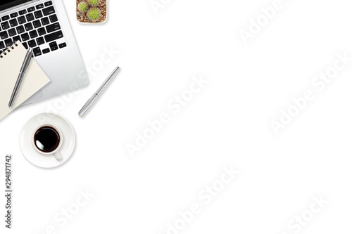 top view workspace business white desk with laptop computer, office supplies and coffee cup using for background