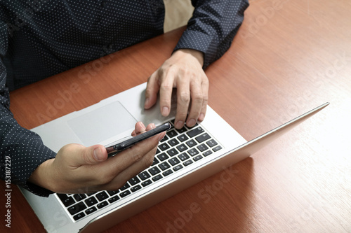 top view,business man hand using smart phone,laptop, online banking payment communication network technology 4.0,internet wireless application development sync app