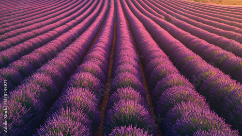 Top-Down Drone View of Vibrant Lavender Field in Full Bloom with Geometric Rows and Golden Sunlight