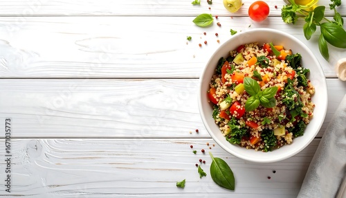 Top-down flat lay of a vibrant, healthy salad in a white bowl on a light wood table. Clean, minimalist composition with ample copy space for wellness or food blogs.