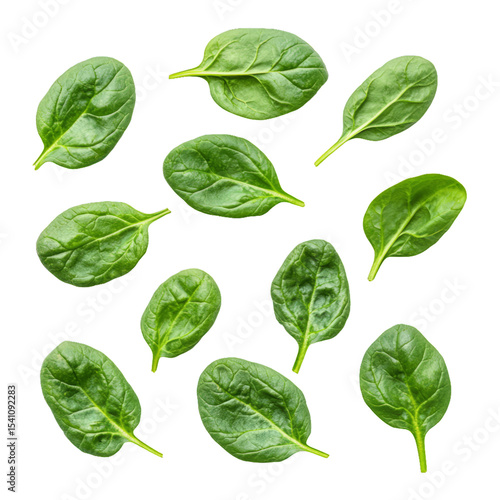 top-down flat lay of leafy green spinach leaves, isolated transparent background