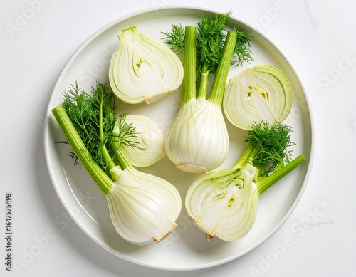 Top-down photo of halved and quartered fennel bulbs arranged artistically on a smooth white ceramic plate