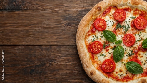 Top-down view of a basil, cherry tomato, and suluguni cheese pizza set on wood, leaving space for text.