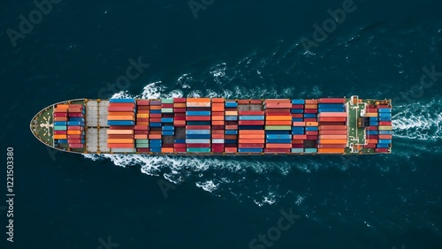 Top-down view of a cargo ship loaded with colorful shipping containers cruising through calm ocean waters, representing freight shipping, export-import business and maritime trade