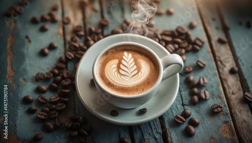 Top-down view of a mocha in a white mug with foam art and coffee beans on wooden surface