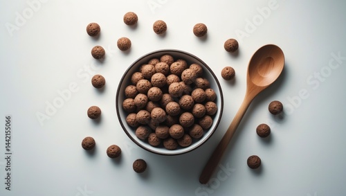 Top-down view of a spoon and bowl filled with corn balls on a background