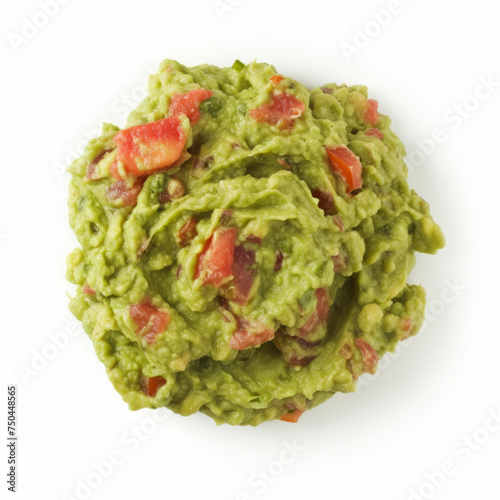 Top-down view of guacamole with rich green color and red tomato accents, isolated on a white background. Fresh Mexican dip concept for culinary design and menu