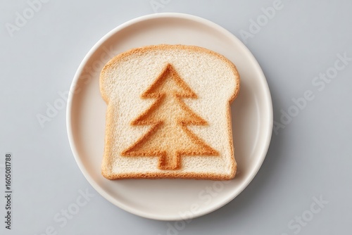 top-down view of minimalist christmas-themed breakfast with toast cut into tree shape white plate