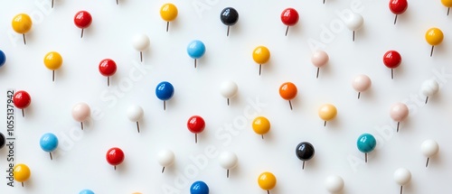 Topdown view of multicolored pins scattered across a whiteboard, creating an organized yet random pattern, clean and highcontrast style